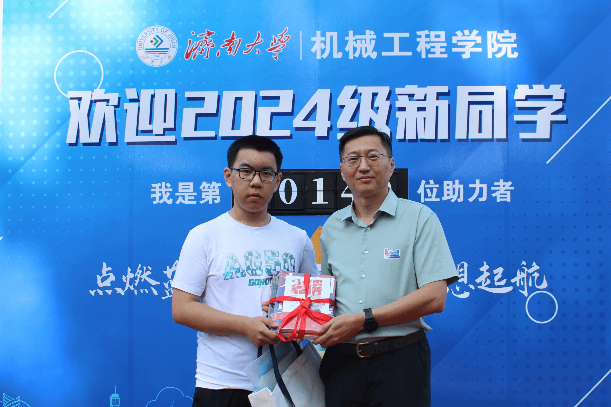 党委书记程涛为同学赠送书籍和新生入学礼包,勉励新生要珍惜大学生活,不忘初心,砥砺前行,并与新生亲切合影留念。现场同学们齐送祝福,表达了对两位同学的真诚祝愿。