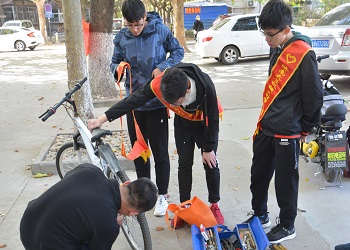 青年志愿者协会义务修车队在校医院西侧开展义务修车活动。