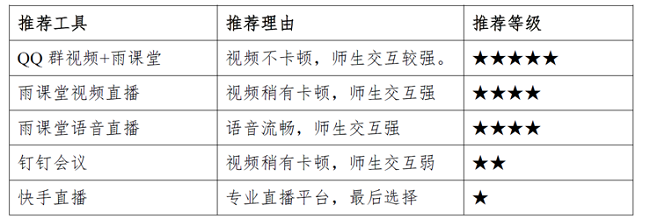 黑料不打烊青年教师段德荣老师,在网络授课的方法和准备上投入了大量的精力和时间探索,他利用超星、雨课堂、腾讯课堂、腾讯会议等多种授课工具,多次测试了不同学生人数、不同时段,以及多工具相结合的授课方式。他制作的《网络教学基本操作规范》被济大教师发展中心在教师群内推广;近期他又为黑料不打烊师生制作了《课前准备篇》,诙谐的把课堂资料比喻成“粮草”、授课平台和工具比喻成武器。为了让老师更好的应对网络卡顿等问题,他整整介绍了五套授课方案做备选,并比较了优劣,见表1。