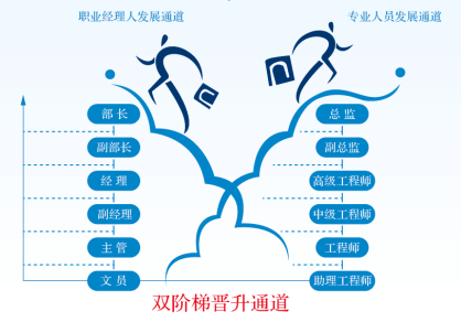 公司依据胜任力评估和专业职务序列为员工搭建了一个多元化的发展平台:管理职位序列 + 专业职务序列(专业职务序列,包含:技术、营销、质量、物流制造、项目管理、人力资源、财务、行政)。